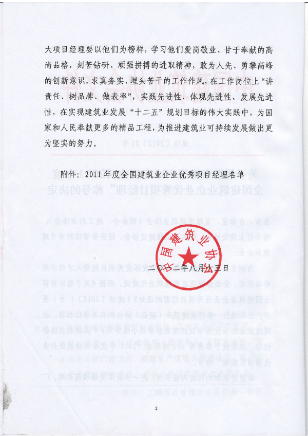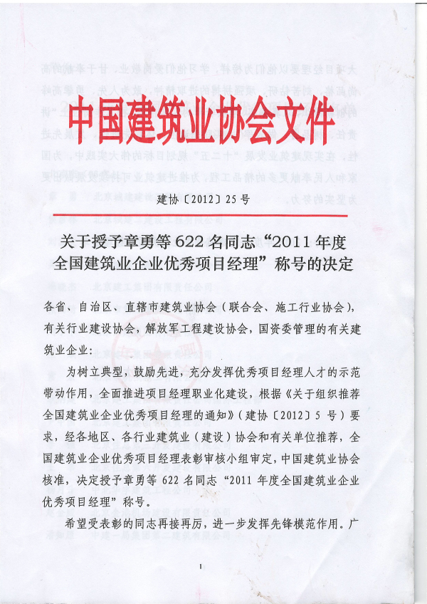 8月22日—23日,由中國建筑業(yè)協(xié)會主辦的“紀念國務(wù)院推廣魯布革工程管理經(jīng)驗25周年大會暨第十一屆中國國際工程管理峰會”在天津市召開。會上表彰了2011年度全國建筑業(yè)企業(yè)優(yōu)秀項目經(jīng)理,我司段鑫同志獲得了該項榮譽。此次,共有來自全國各地區(qū)、各行業(yè)建筑業(yè)(建設(shè))協(xié)會和有關(guān)單位推薦的的622名同志獲得了該殊榮。